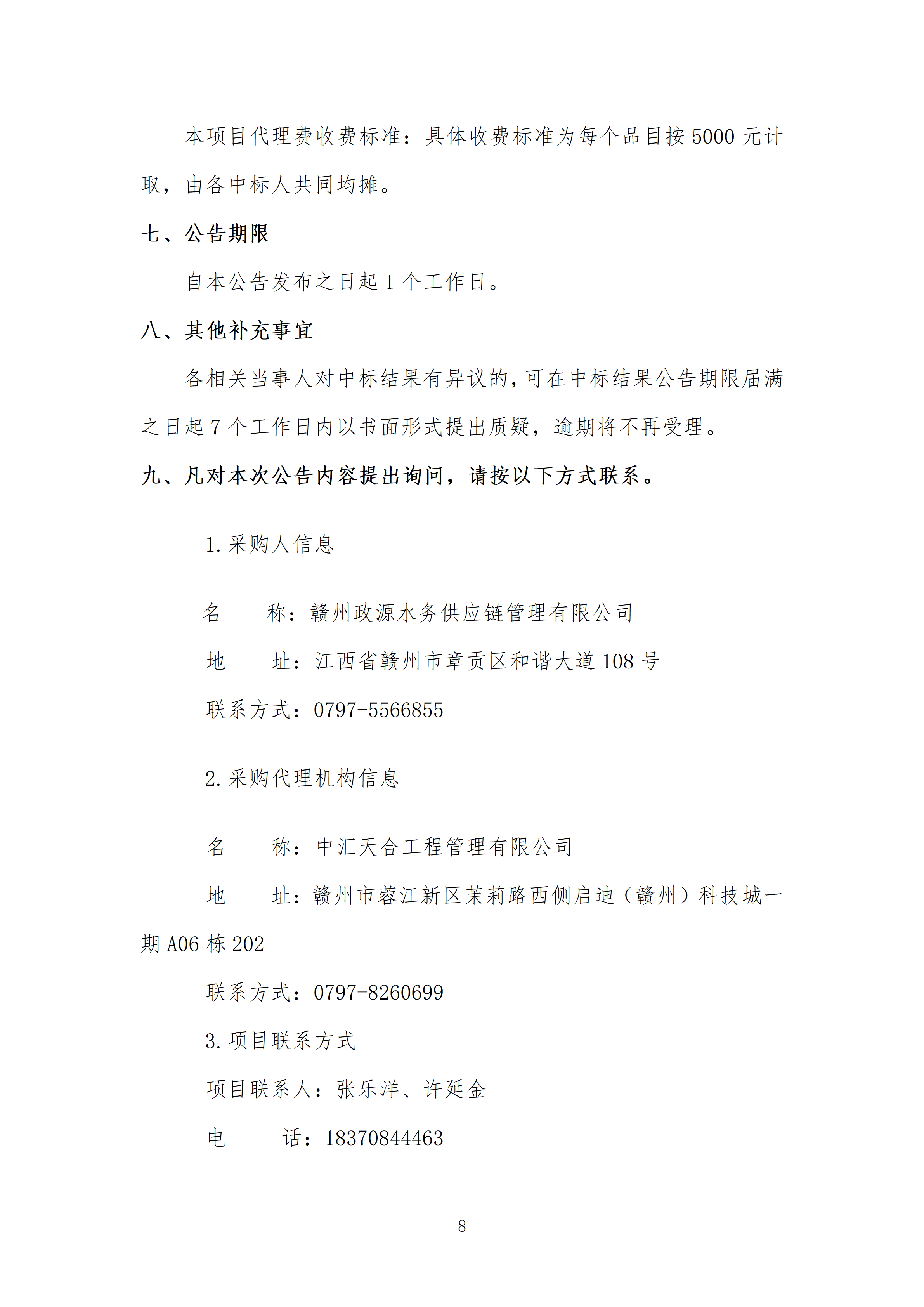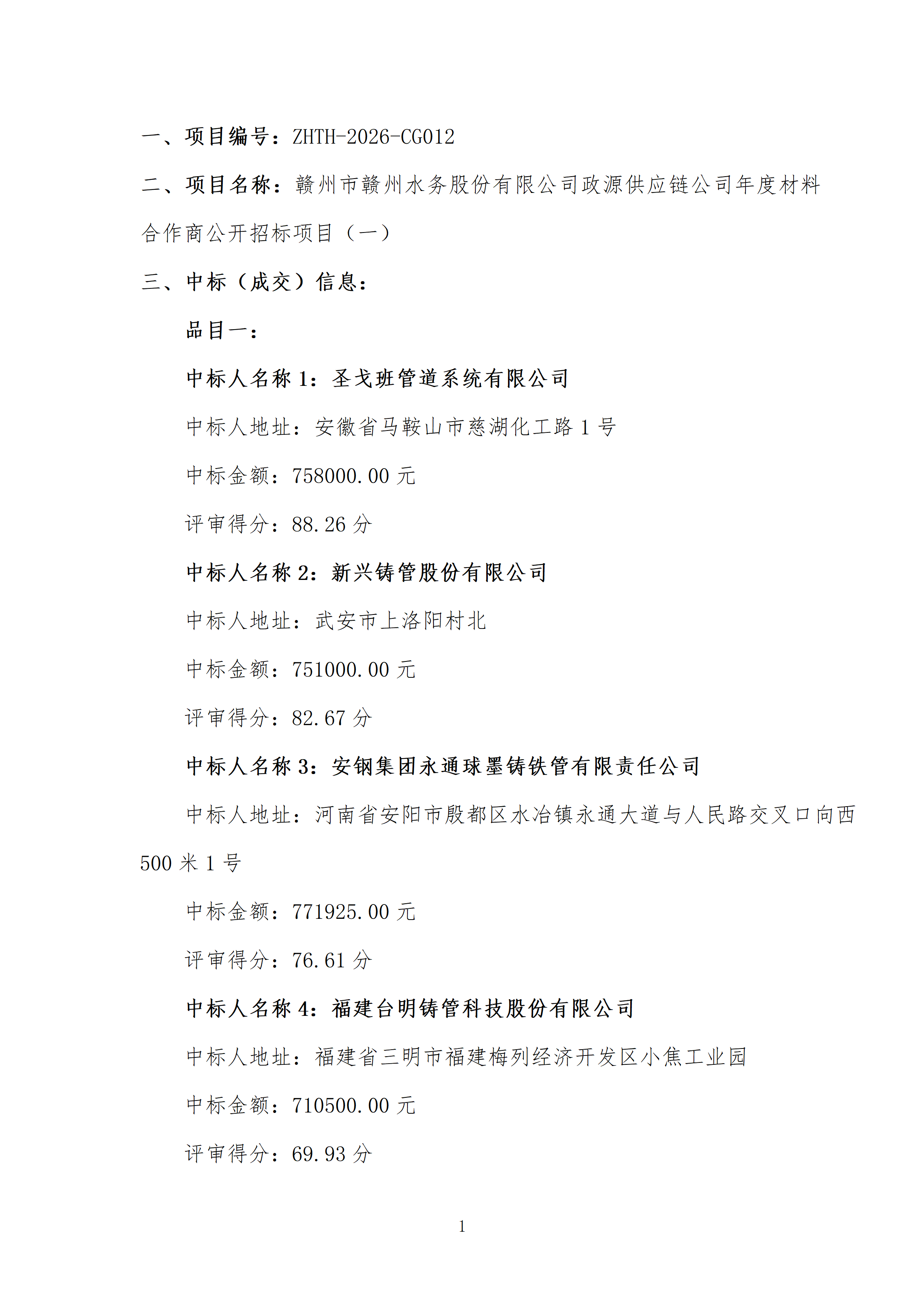 中汇天合工程管理有限公司关于江西省赣州市赣州水务股份有限公司政源供应链公司年度材料合作商公开招标项目(一)-品目四(项目编号:ZHTH-2026-CG012)的流标公告