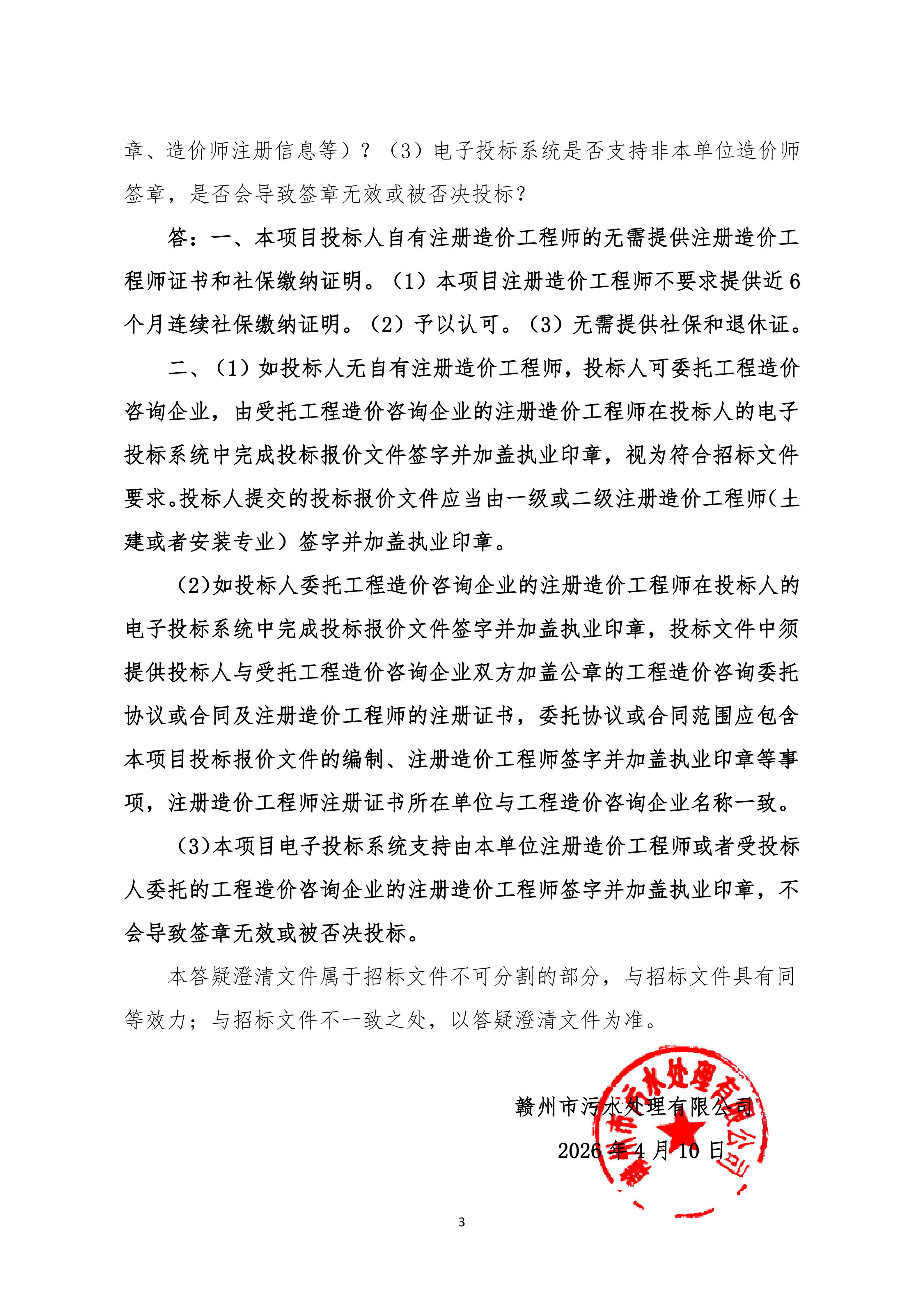 赣州市中心城区污水处理设施提质增效工程供配电工程答疑澄清文件
