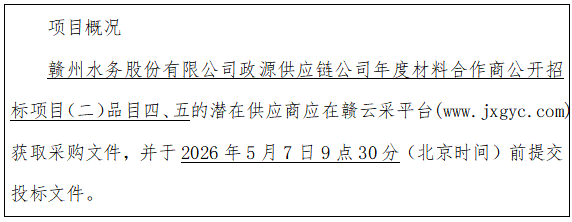 项目名称:赣州水务股份有限公司政源供应链公司年度材料合作商公开招标项目(二)