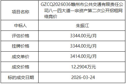 赣州市公共交通有限责任公司八一四大道一宗资产第二次公开招租网络竞价成交公示