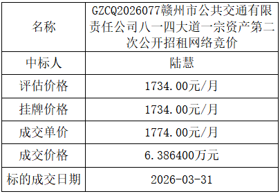 赣州市公共交通有限责任公司八一四大道一宗资产第二次公开招租网络竞价成交公示